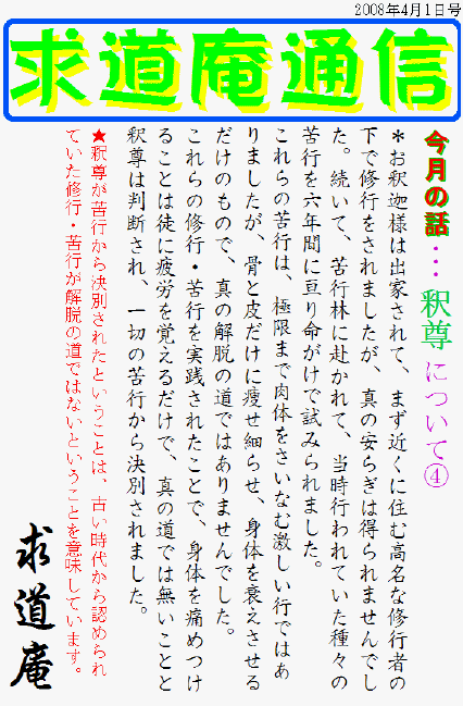 しかし、この苦行もまた釈尊にとられては、身体を衰弱させるばかりのもので(右写真の苦行像)、