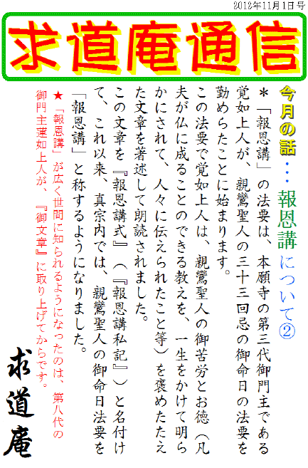 その後、第八代御門主の蓮如上人が、『御文章』の中に「報恩講」を取り上げ広められて、各寺院・各家庭においても、
