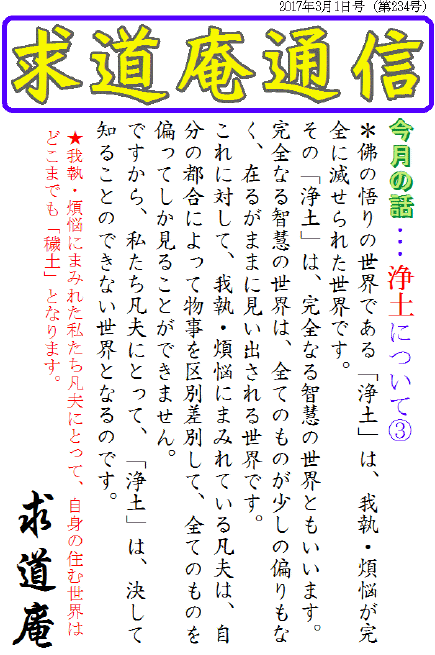 ★悟りの世界である「浄土」は清らかな世界という言葉で表現されますが、この「清らか」の意味するところは、一切の我欲を消し去った状態をいいます。