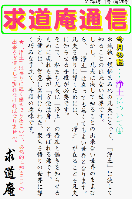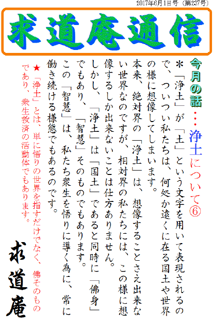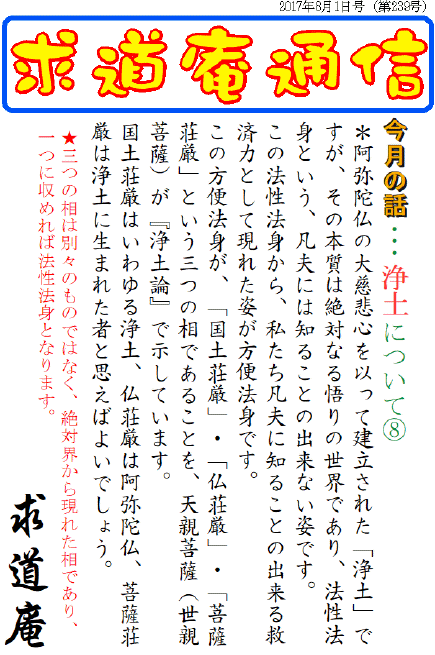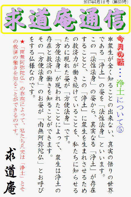 この「法性法身」に対して「方便法身」のお姿は、先月号(第235号)でも説明したように、私たちに分かるお姿を持たれた仏様です。