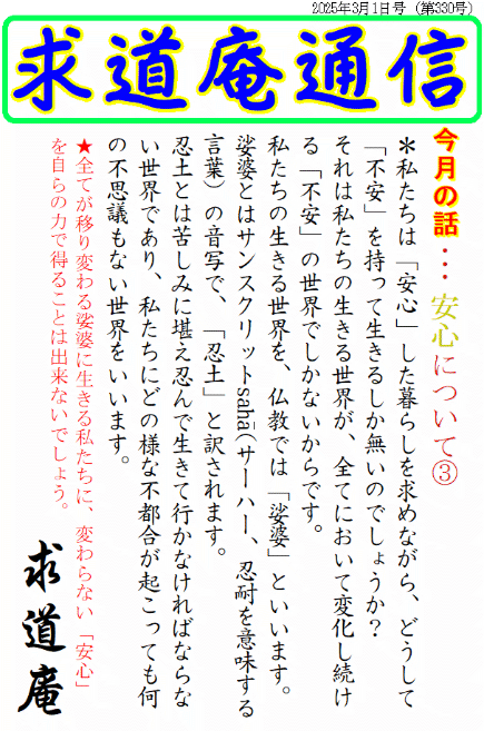 その様な状況の中に生きる私たちにとって、これまた変化する自分の心で「安心」を求めるという事は不可能でしょう。