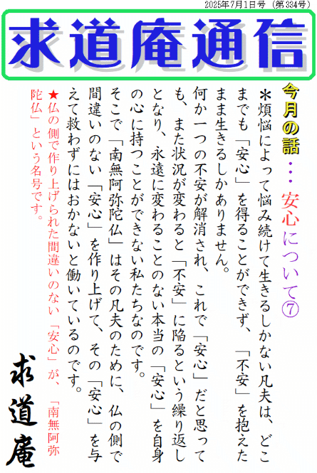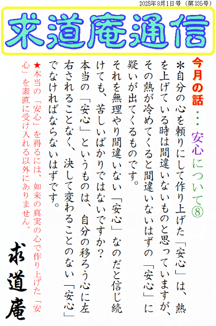 私たち凡夫が本当の「安心」を得るには、自身の心に頼ることなく、最高の境地に至り悟り開かれた仏から与えられる「安心」を素直に受け入れる以外にはないでしょう。