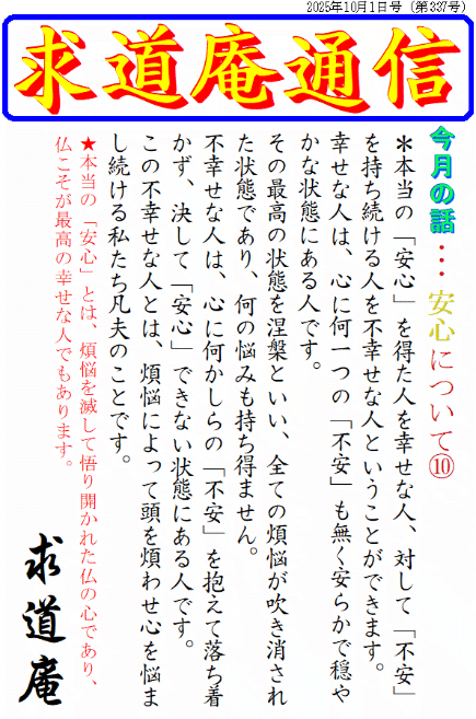 ★仏法の教えによって、自らの力で何事が起っても動じることの無い本当に「安心」した境地に至ることが出来る聖者であるなら、「不安」に陥ることはありません。